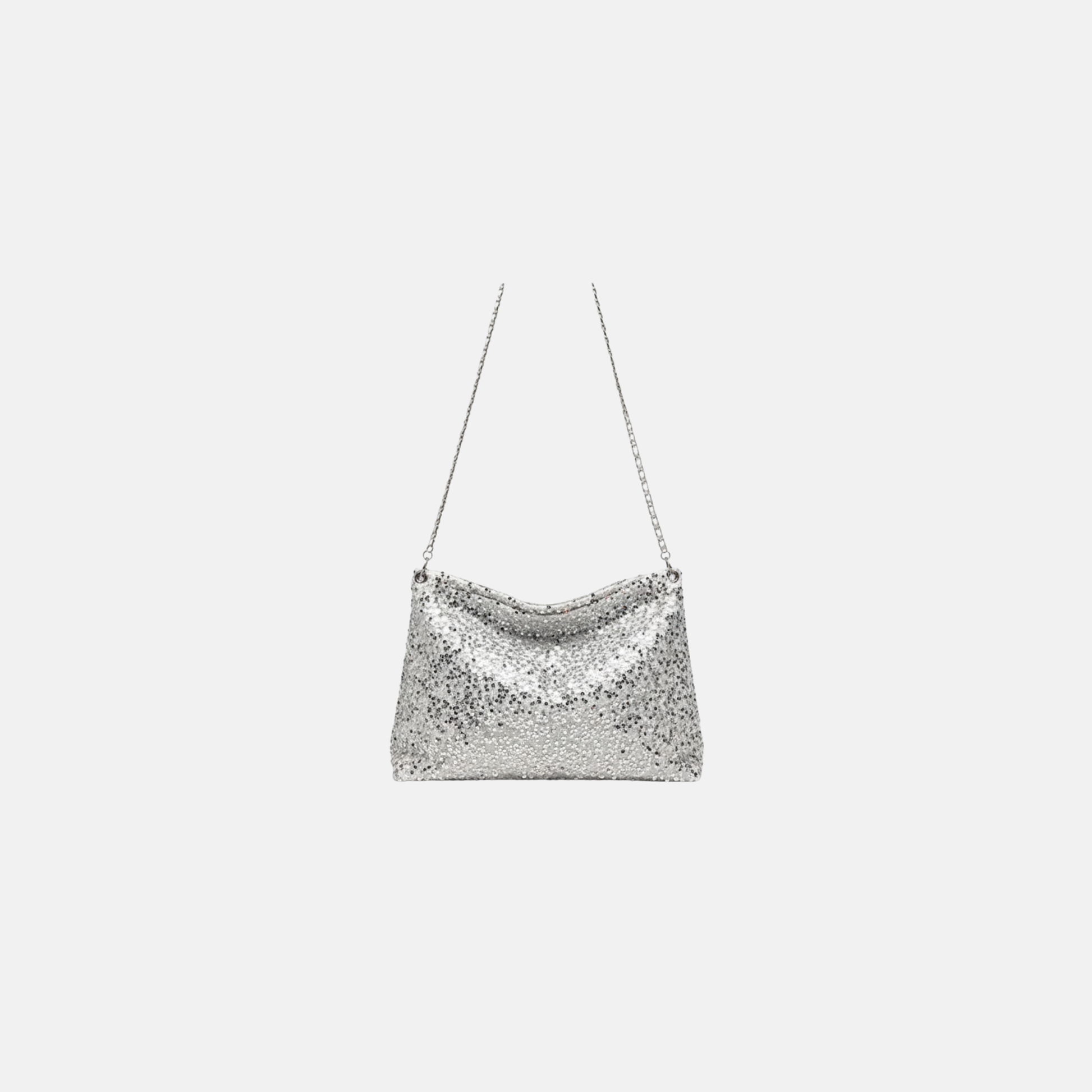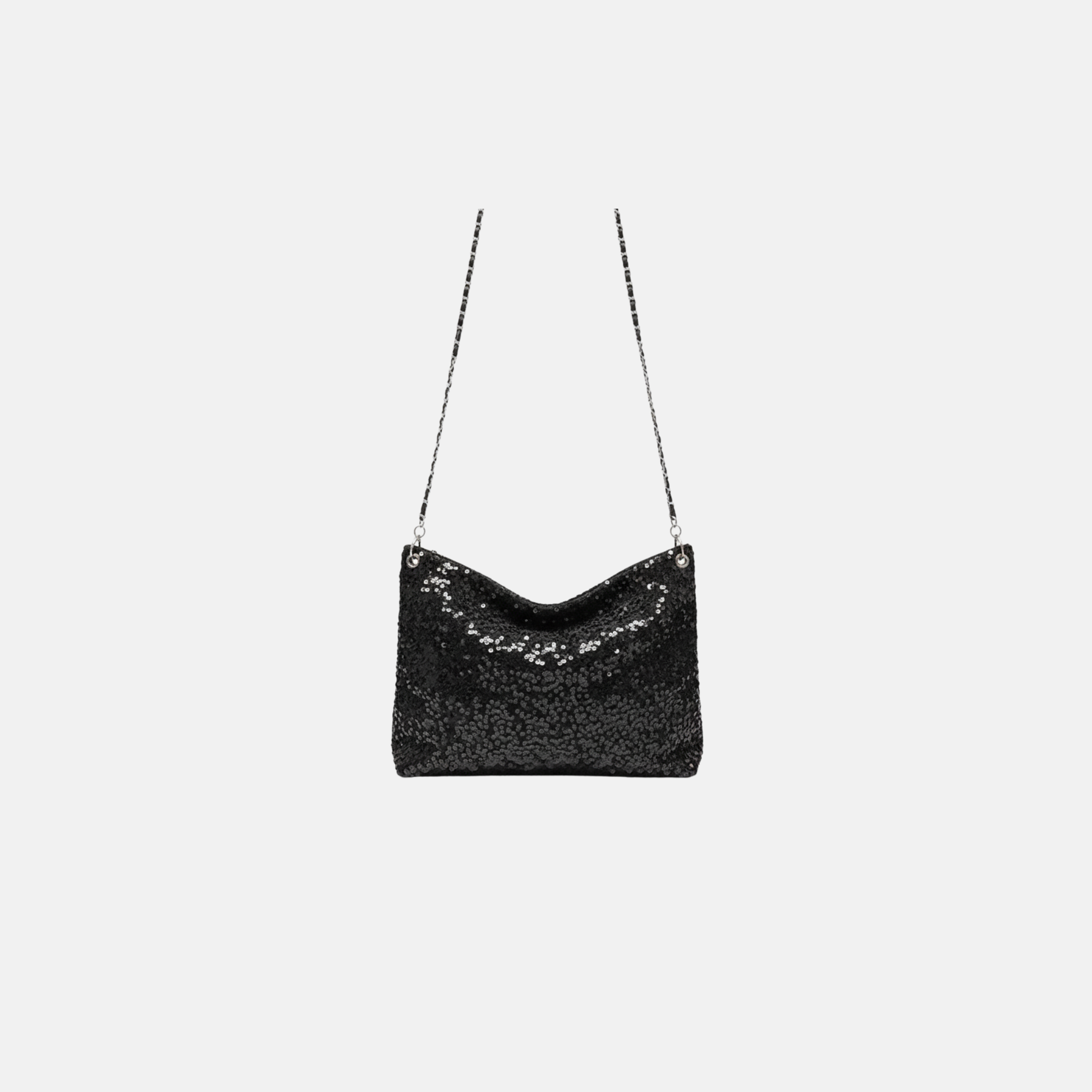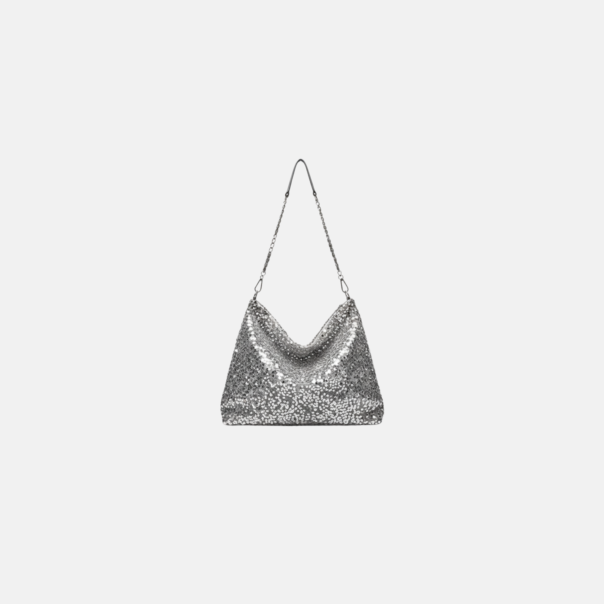 Apresentamos a deslumbrante Glow Bag, uma bolsa que promete iluminar qualquer look e ocasião. Confeccionada com um exterior totalmente coberto por lantejoulas, esta bolsa é um verdadeiro espetáculo de brilho e glamour, capturando a luz e refletindo-a a cada movimento.